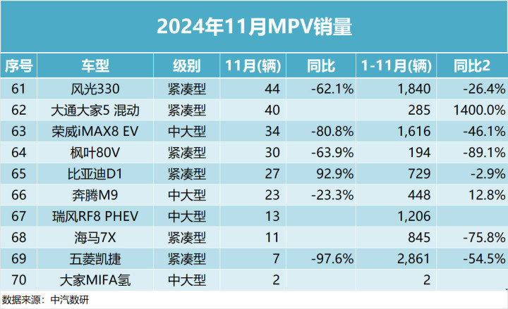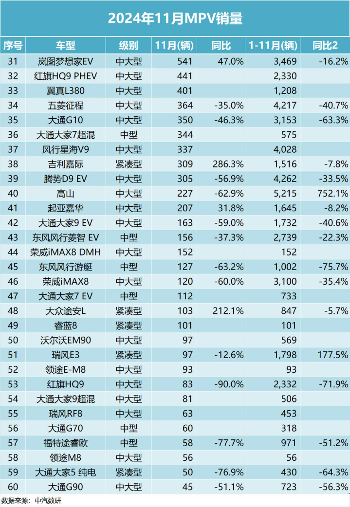 2024年11月全国MPV销量排行榜变化较大,丰田何瑞维亚以1万辆的成绩排名第一,五菱宏光、丰田赛那紧随其后,腾势D9 DM-i近几个月销量有所下滑,岚图梦想家PHEV和传祺E8 PHEV等新能源MPV车型则表现也不错。